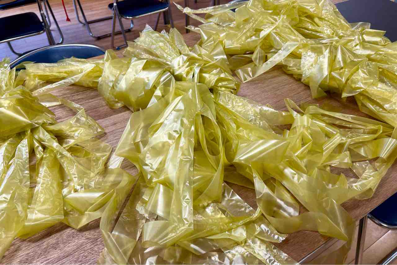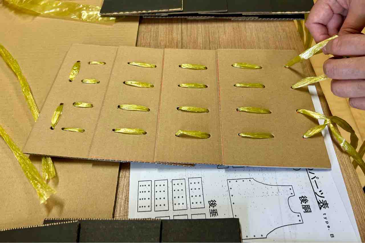 できあがった型をビニール紐で繋ぎ合わせていきます。あまり緩くすると見た目が悪くなるので、しっかりと繋ぎ合わせていきます。