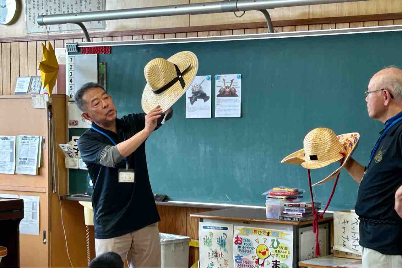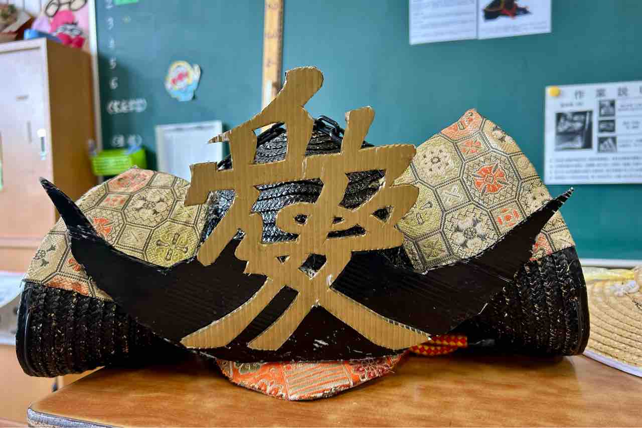 この日は伊集院小学校で紙よろい普及会の指導のもと紙よろい作成体験がありました。