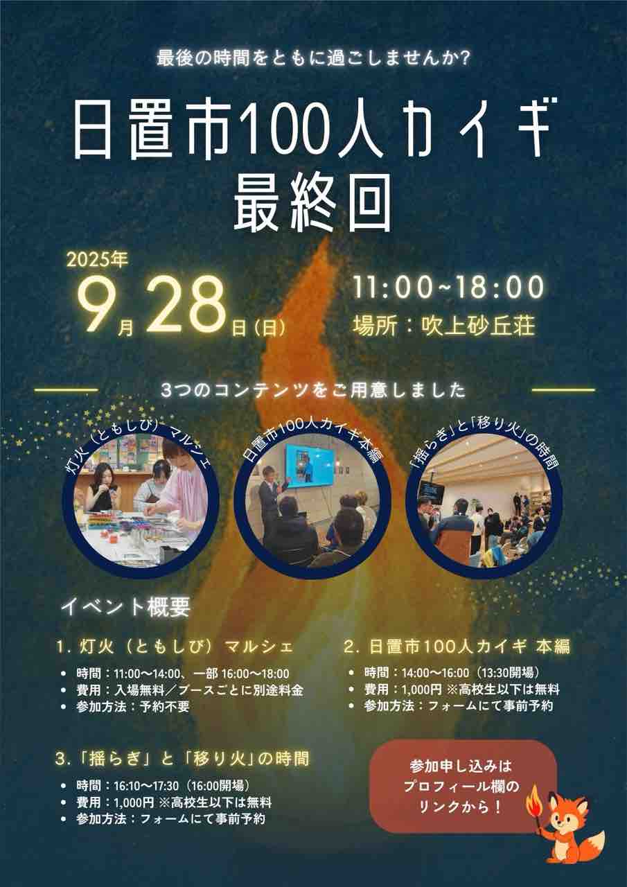 日置市100人カイギは、2025年9月28日(日)に第20回目、そして最終回を迎えます。集大成となる今回は、これまで参加してくださった方はもちろん、初めての方も楽しめる3つのコンテンツをご用意しました。すべてに参加しても、一部だけの参加でも大歓迎です。