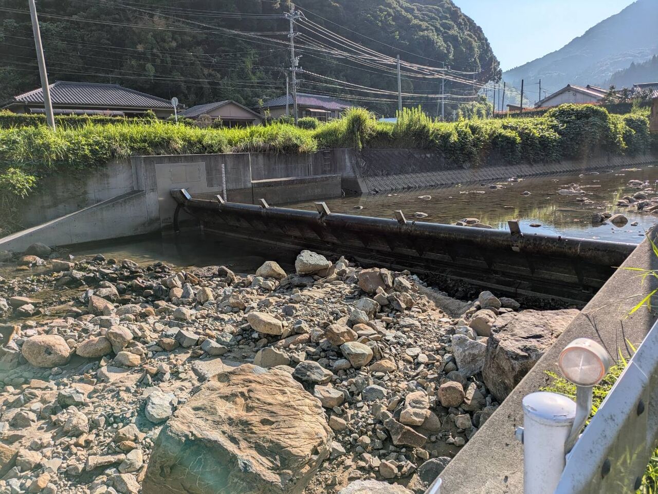 大雨で、倒していた、井堰のゲートを持ち上げるとの情報。