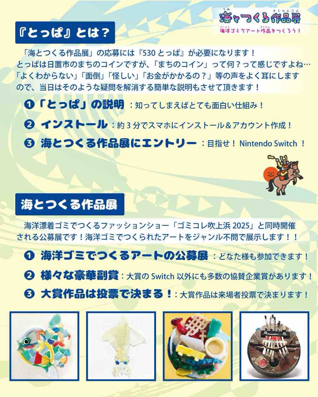 「海とつくる作品展」では海洋ゴミを使ったアート作品を広く募集していますが、