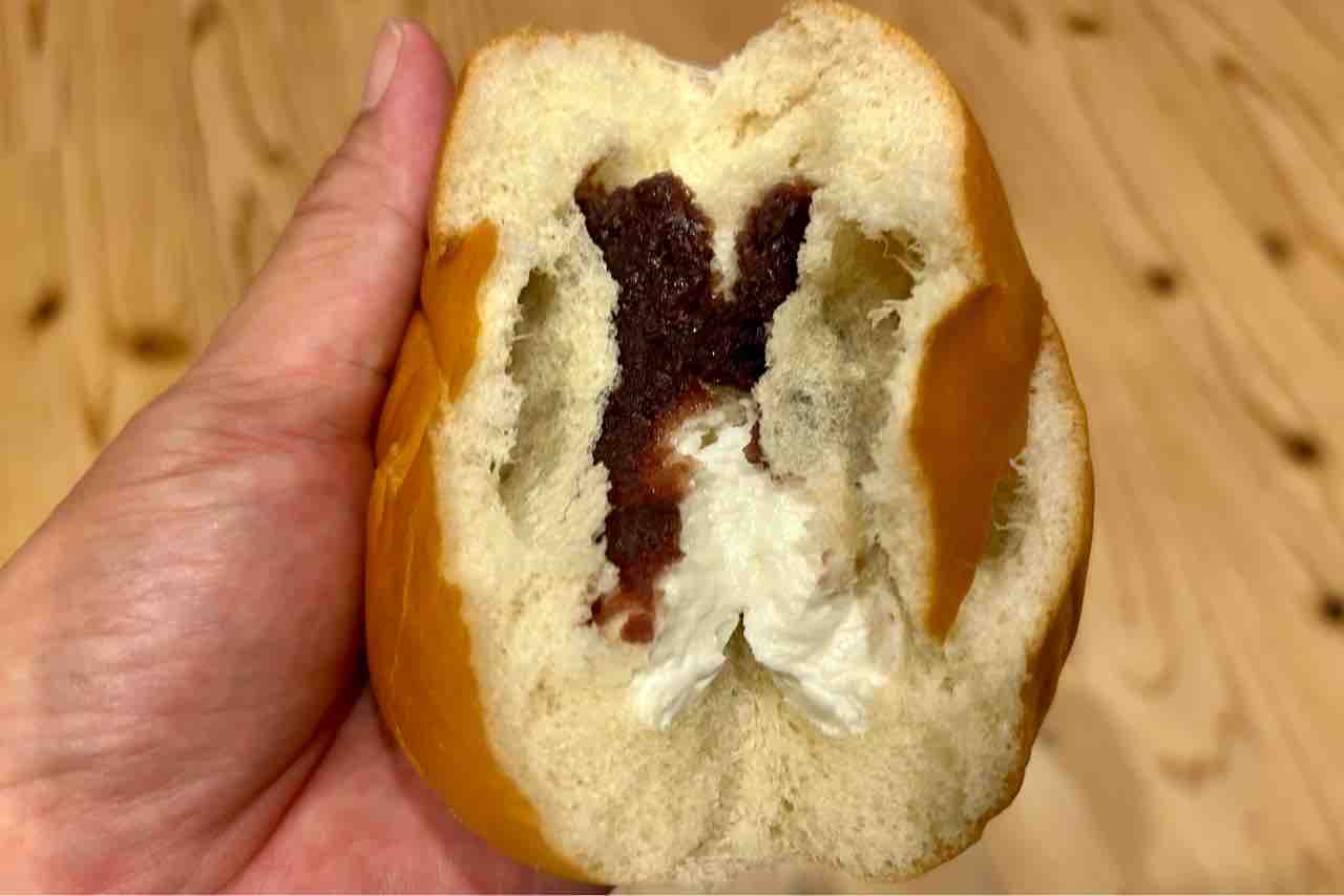割ってみると、しっとり生地の中にやさしい甘さのあんことホイップがしっかりと入っている。