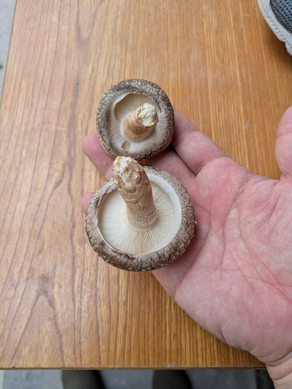 ひおきの暮らし ひおきの食 原木しいたけの道 今年もやってきました。 収穫の時期が!!! 2025.11.10 せっぺとべお せっぺとべおです。11月上旬暑くて、まだ、夏って感じでしたが、ようやく、朝晩が涼しくなってきました。 少し毛布が良いかなと…。となると!趣味の原木しいたけが出てくるはず。一度、寒くならないと刺激がなくて、出てこないんですよ。ほら、出てきてます、おっ! 下にいいサイズも発見。出てます。桜の原木からも出てますね。初収穫は、この2つでした。いただきます。あと、5日もすれば、残りが大きくなるな。