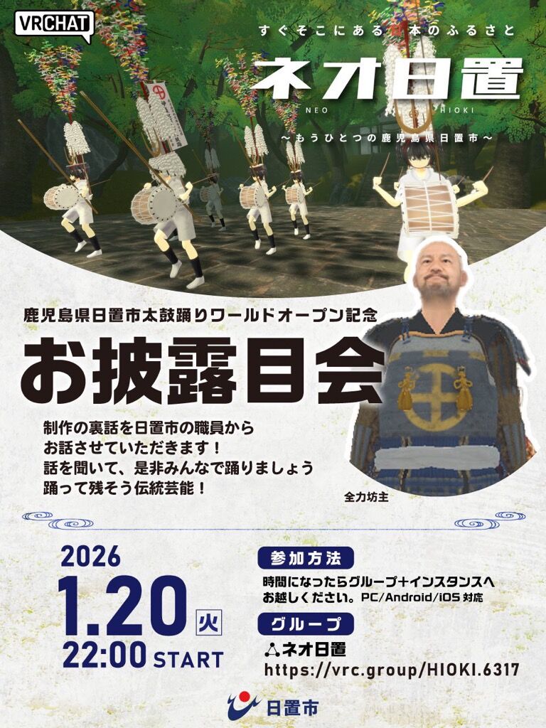 (VRChat空間内での「太鼓踊りワールドお披露目会」は午後10時から)