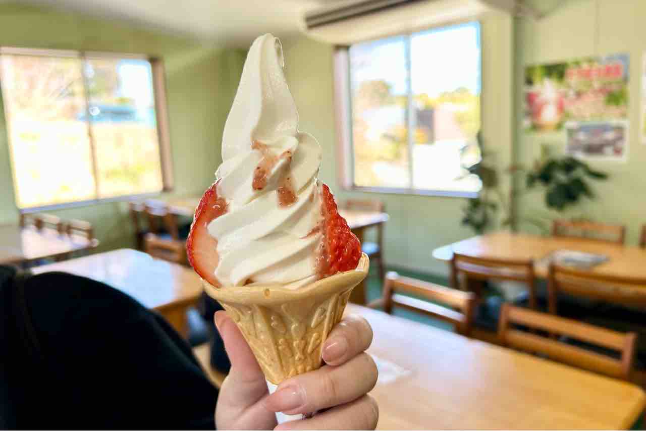 食べてみると、いちごの甘さがソフトクリームにも負けていない。ソフトクリームと合わせて食べることで味わいがさらに深くなる。