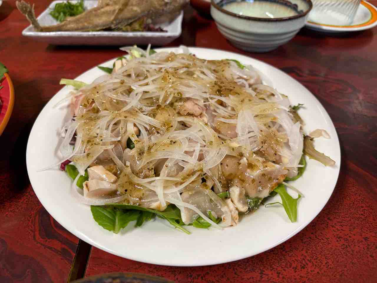 なんと、鳥刺しと思いきや、少々火を強く通した鳥刺しをカルパッチョにしたもの。