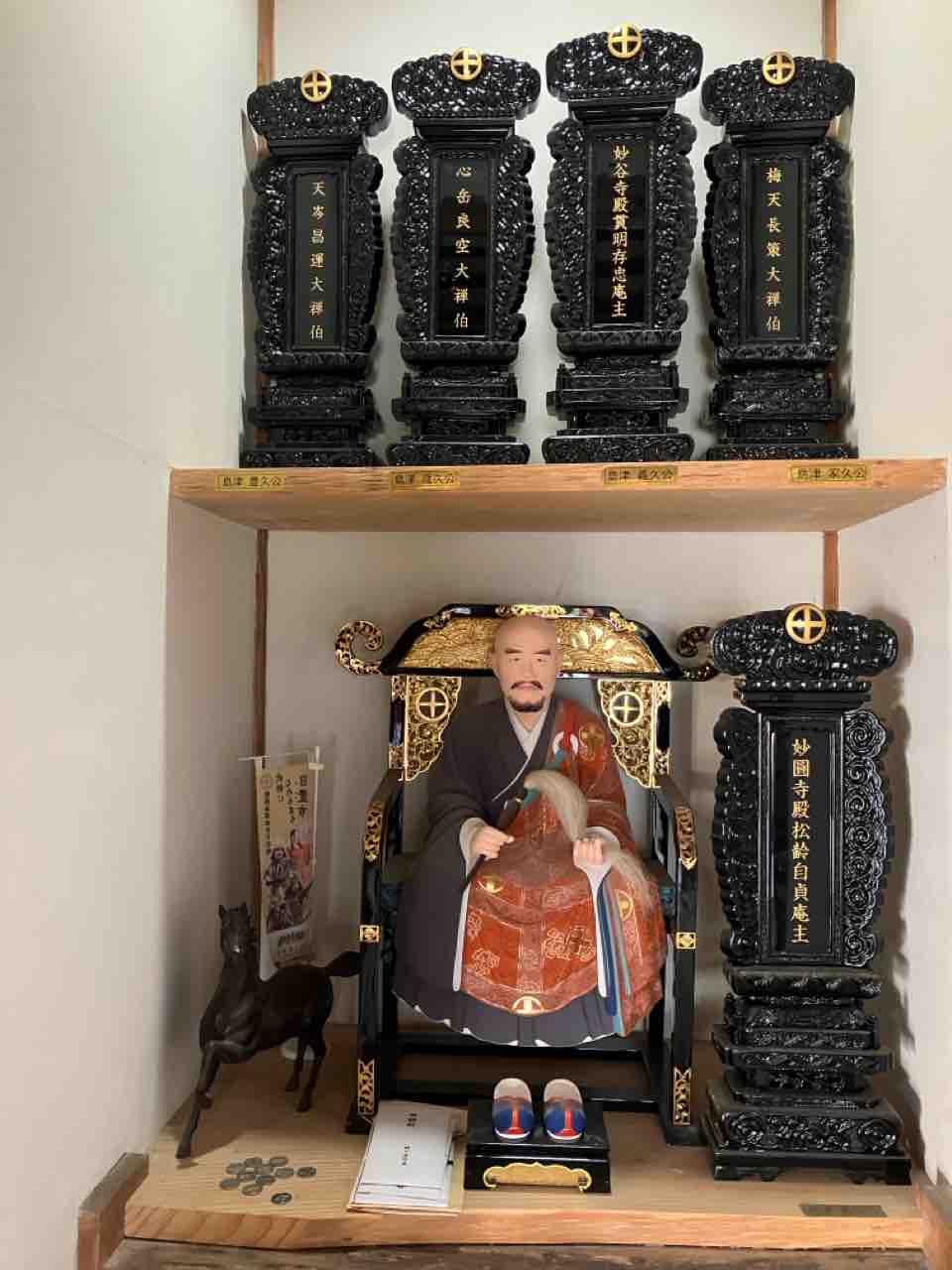 島津四兄弟と島津豊久の位牌。新しく作られた島津義弘公の木像も見ることができます。