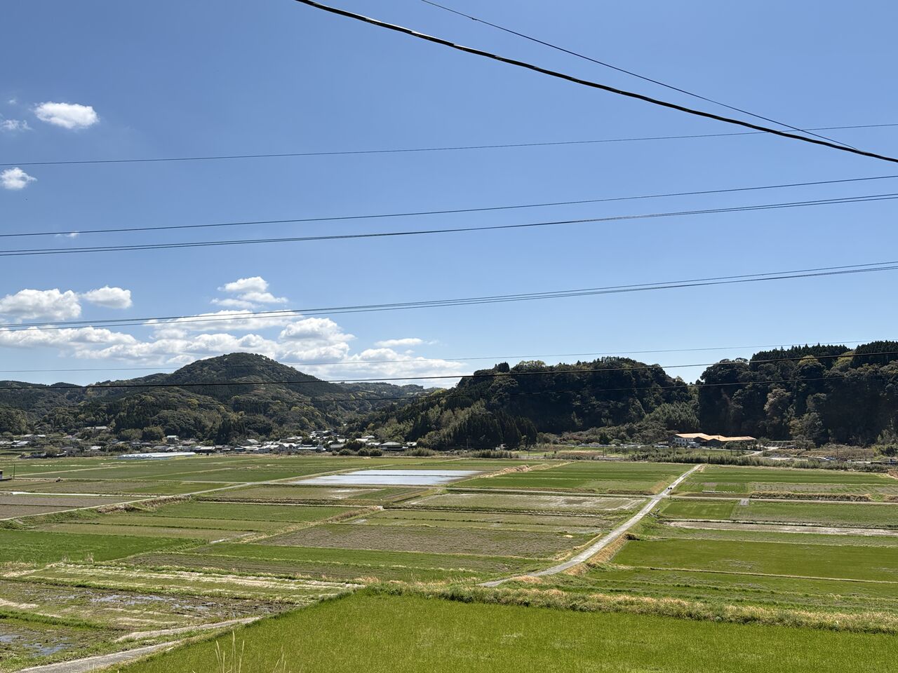 駐車場には綺麗なお花もあり、奥に田園風景あり、青空もあり。